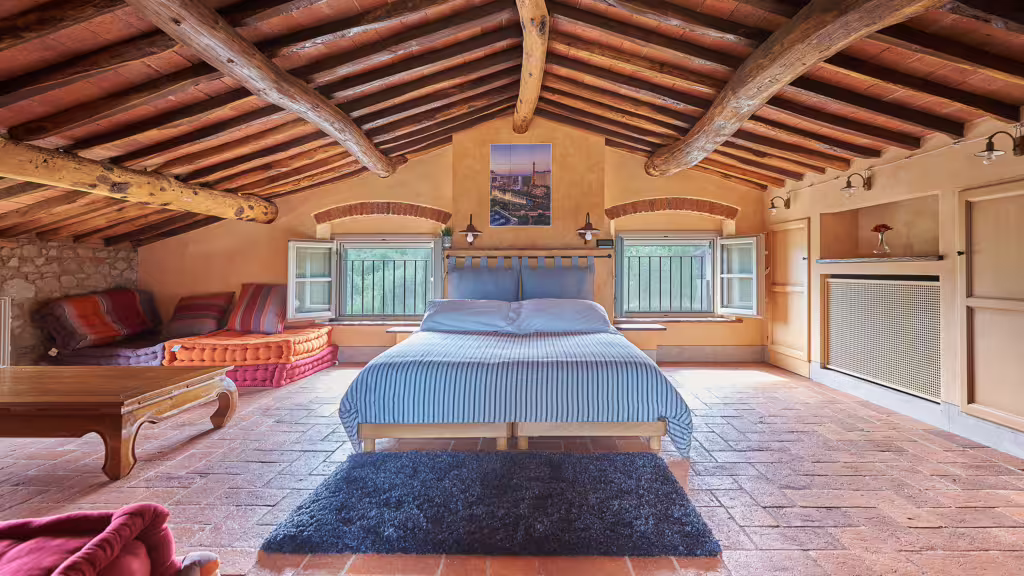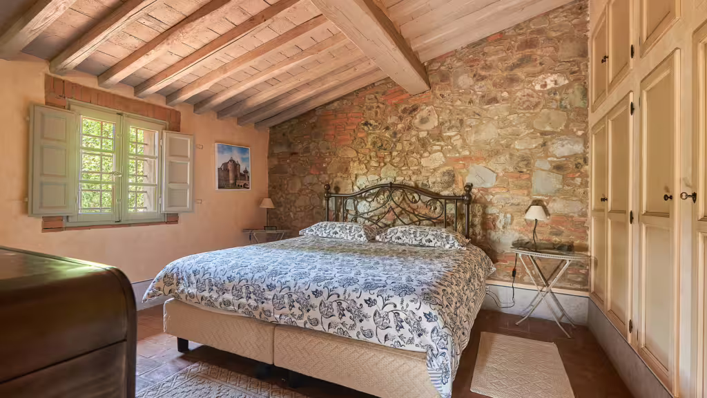 The staircase leads to the master bedroom. You’ll find a toilet between the ground and the first floor. The master bedroom on the first floor is very spacious. It has a sofa, a television, and a desk to do work. The master bedroom also has a fireplace, a king-sized bed, and lots of closet space. On the first floor, you’ll also find a luxurious bathroom with a bathtub, a separate shower, and a toilet. Another staircase leads to a bedroom on the second floor. You’ll find another toilet between the first and the second floor. The bedroom on the second floor is very spacious and sleeps up to four people. There is a king-sized bed as well as two comfortable sofa beds. The bedroom offers magnificent views of the Tuscan hills. You’ll also find a small bathroom with a shower on the second floor.